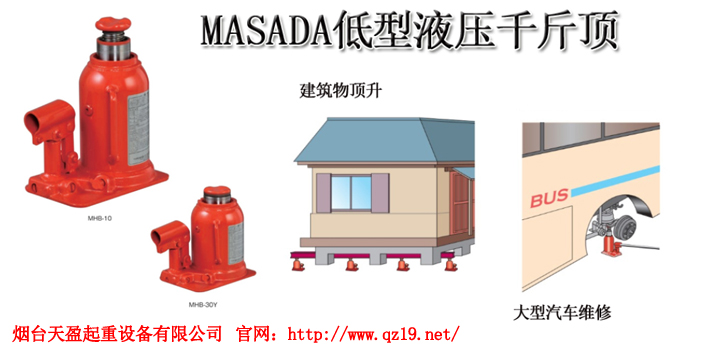 烟台天盈起重设备有限公司销售:MASADA低型液压千斤顶,低型设计适合狭窄场合使用,可横向顶升,适用于建筑施工、汽车维修等场合,详细介绍可参考以下内容: